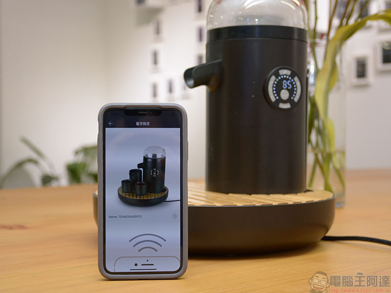 既然是現代科技的與傳統茶道的結合,除了手動從機身按扭控制外,TEAMOSA 可以搭配專屬應用程式來展現它智慧的一面。在應用程式中,每次使用 TEAMOSA 前以藍牙與手機與連接。當你按下應用程式中位於「我的」頁籤中的「藍牙設定」時,系統會自動偵測並顯示離手機最近的 TEAMOSA 智慧泡茶機,便於手機與之連線。