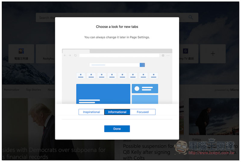 我選擇的是 Informational,首頁除了有搜尋功能、常用網站外,下方還會有來自微軟新聞的內容: