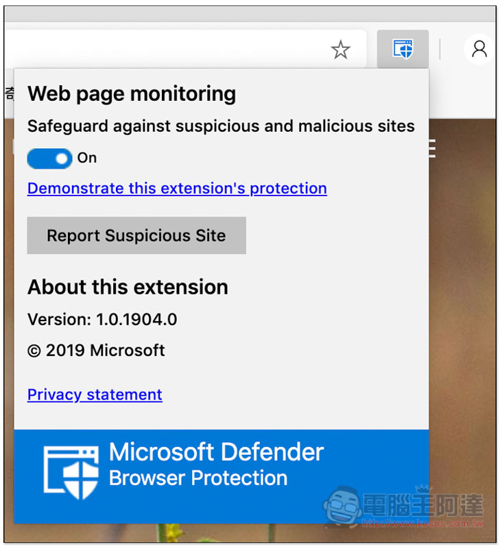 另外在網址列右側會看到內建的 Microsoft Defender 防毒保護功能,它會隨時掃描你正在瀏覽的網址,有問題會立即通知: