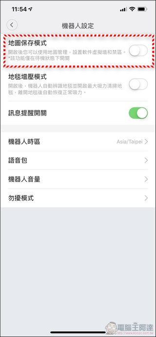要開啟這個功能必須開啟設定中的「機器人設定」–>「地圖保存模式」,因為石頭掃地機器人雖然會偵測您家中的格局,但其實它的每次打掃對它來說都是從零開始(不會記錄也不會上傳),所以要設定清掃區域與設定禁區的話,就必須將LDS偵測出的格局記錄在機器人裡面,如果您擔心有資安隱私一律的話建議就不要使用此功能: