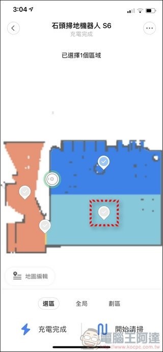 設定清掃時間、頻率與模式最後開始「選擇區域」功能即可,以後您就可以任意選擇想要掃地的時間區域來分區打掃了: