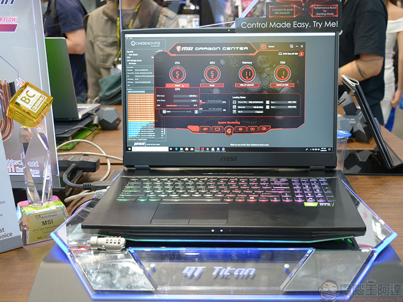 這次微星展出的電競筆電陣容中,首先最有看頭的就是在本屆獲得 COMPUTEX Best Choice 獎項的 GT76 Titan,這款產品簡直可說是玩家們的重裝備,除搭載最新 Intel Core i9-9900K 處理器與 NVIDIA GeForce RTX2080 顯卡,具備四個記憶體插槽,連接埠方面更不用話說,一應俱全。其 17 吋顯示器備有 144Hz 和 4K 選項,就算用來作為開發者或重視效能的影音創作者來說都是一款非常棒的工作站。