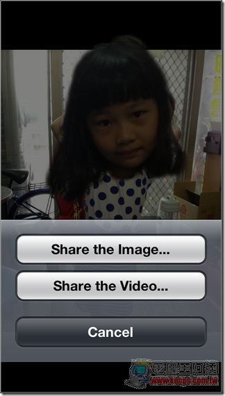 接下來會有一段您的頭變大的動畫,很可愛,確定滿意後就可以點擊「分享」看要分享圖片(Share the Image…)還是分享影片(Share the Video):