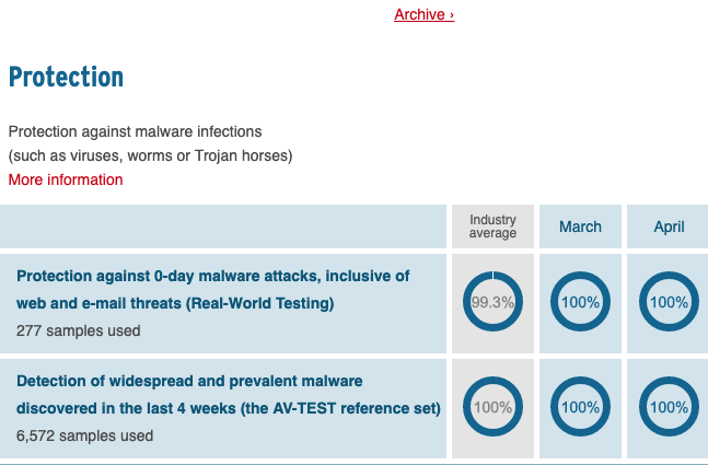保護測試部分共分成兩塊,他們先使用 277 個最新病毒攻擊,包括網頁與 E-Mail,接著再利用過去 4 週已知的 6,572 的病毒範本,來測試這套能不能檢測出來:
