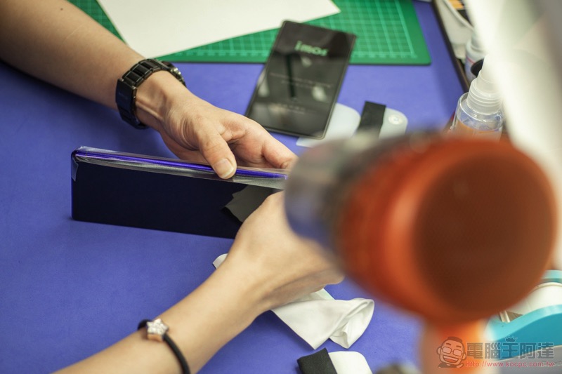 完成了在一旁觀看都緊張度飆高的邊框部分,接著來到背殼部分 — 是說,之所以會將邊框、背殼與正面螢幕分開貼膜施工,主要是如此一來,未來即便不小心傷到某個部份,也可以分別針對不同的位置來重新施工,不需要全部移除: