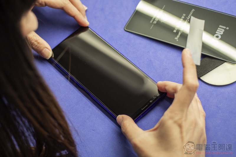 Xperia 1 的背殼採用的是與正面螢幕類似的 2.5D 玻璃,除了邊緣的曲面會很考驗包膜師的功力外,針對突起的三鏡頭部分,也需要進行精準的裁切: