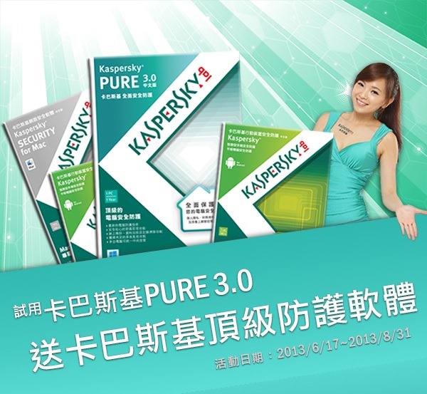 現在還有試用PURE 3.0送卡巴斯基頂級防護軟體的活動,心動的朋友們快動動你的手指,大獎離你就不遠囉!(請點我)
