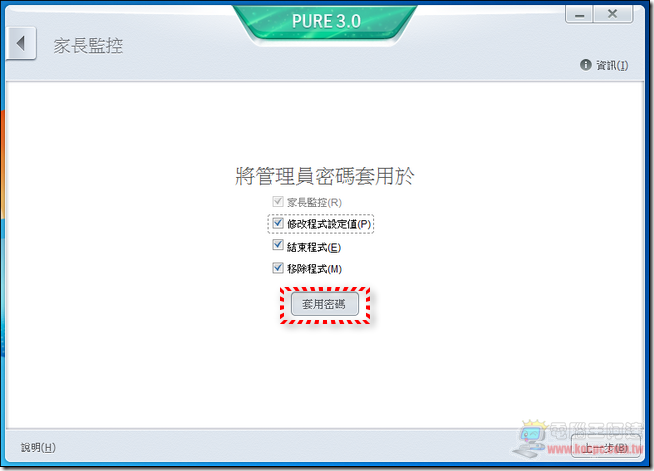 Kaspersky PURE 3.0具有所謂的家長監控功能,可以讓小朋友遠離一些不該看的網站,或是限定電腦的使用時間,避免小孩太長時間沉迷於網路與電腦,只要先設定管理者密碼: