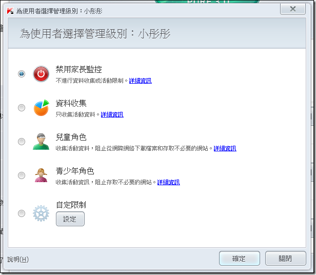 並可以為特定使用者直接設定監控類型,或是自訂各種使用限制: