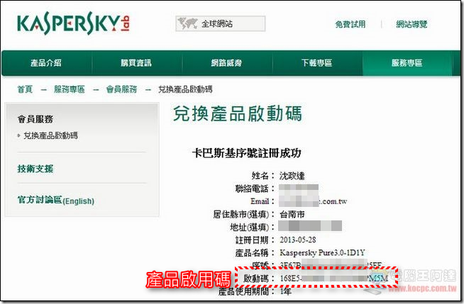 Kaspersky PURE 3.0安裝必須要輸入「啟動碼」才能使用,但啟動碼並不是手冊內的序號,而是要先去官網(請點我)登錄使用者個人資料與產品註冊序號後,才會收到軟體啟用碼: