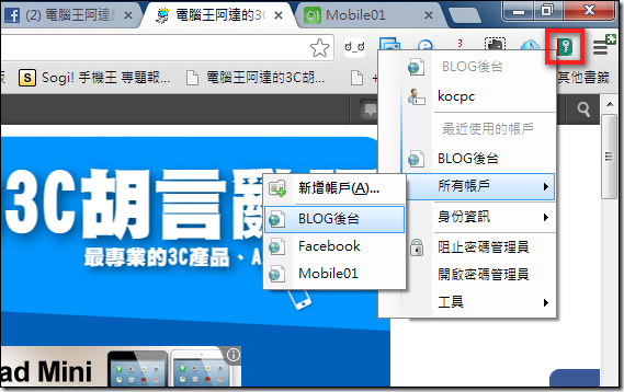 使用瀏覽器外掛就更方便了,直接就可以快速開啟與登入常去的網站(但是您「密碼管理員」的密碼就相對重要了,千萬不能忘記 XD):