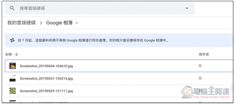 在 Google Drive 就能看到 Google 相片的所有相片,非常方便管理以及修改,不過現在進到這資料夾後,上方就會顯示 7 月起這資料夾將不再與 Google 相簿同步處理的訊息: