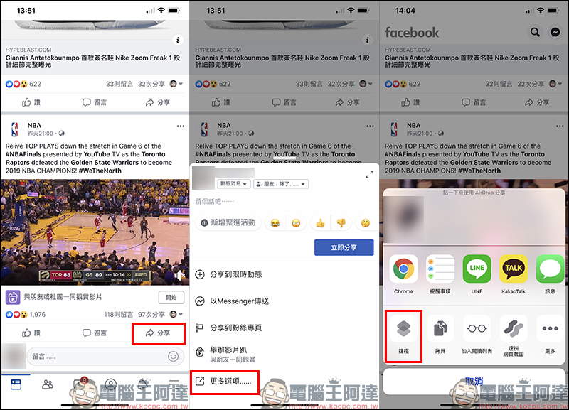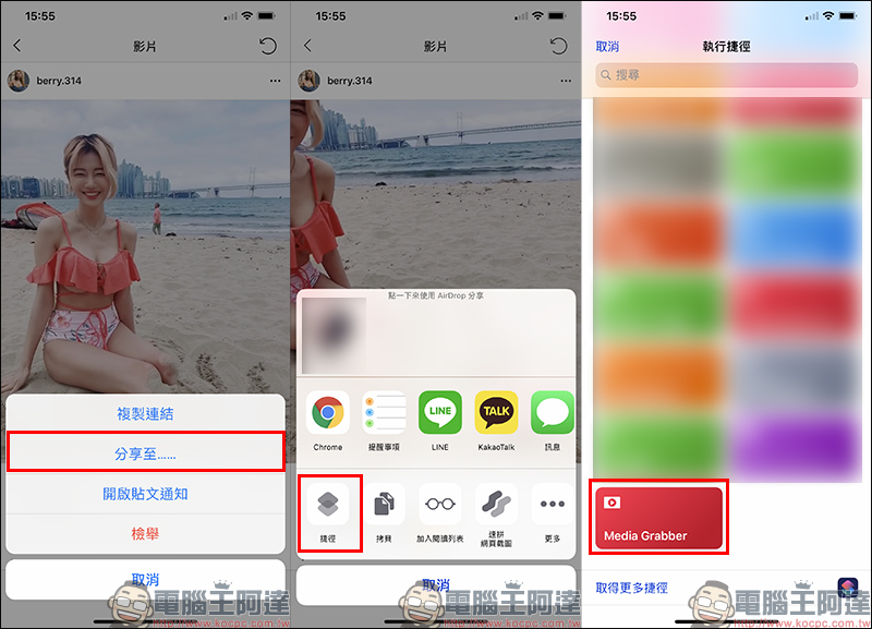 Media Grabber 的使用方式超簡單,首先記住我們必須取得(複製)該網站影片的連結,接著前往捷徑 App 使用 Media Grabber 開啟。如果懶得先複製連結再前往捷徑 App ,其實現在像是 YouTube 等網站也都能透過分享按鈕直接前往捷徑 App 開啟: