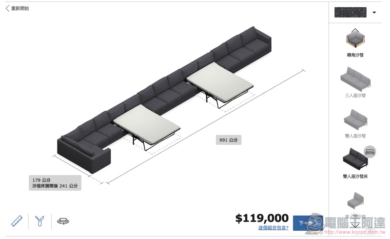 選完想要使用的沙發品項,接著就可以進入客製化的頁面。以下只是簡單的加長惡搞… 不僅能夠直接選擇材質、搭配的沙發類型(轉角、三人座、沙發床等),更可以直接看到完成後的尺寸,甚至是沙發床等功能展開時的樣貌:
