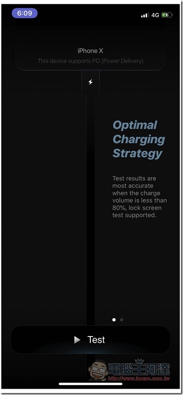 這款 Mister Battery 的使用方法非常簡單,接上充電線後打開 App,它就會偵測你的 iPhone 型號,如果支援 PD(Power Delivery) 快充下方也會註明。按下方的 START 就會開始偵測充電速度: