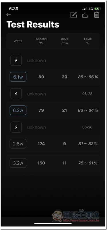 頁面往右滑後,還能查看每次測試的結果,除了有瓦數,還會計算每分鐘充飽多少 mAh 電池容量: