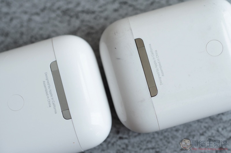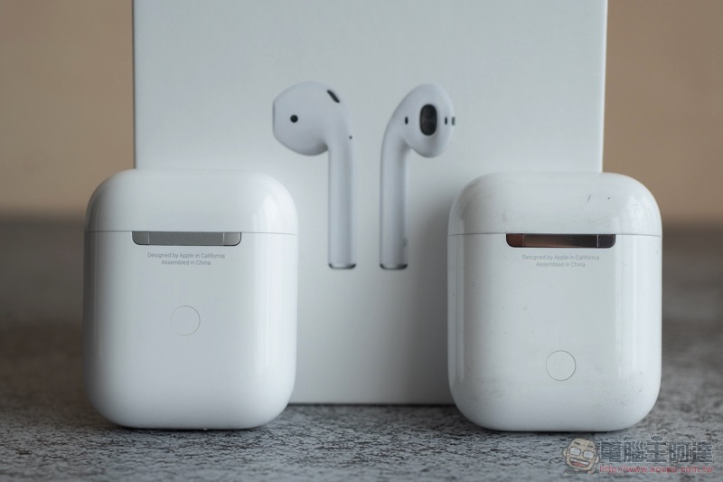 比較一下手上的兩代產品,最明顯的差異其實就是燈號的位置 — AirPods 2 將狀態燈號放在了充電盒的外側:
