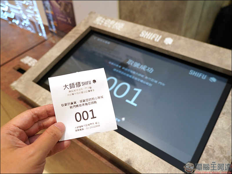 這裡就來分享一下整趟維修流程,在大師修各門市的現場都會有台排隊取號系統,消費者只要點選系統上的按鈕就能進行送修、取件、退件等操作,假如初次到訪不會使用系統也別擔心,門市人員會貼心教導操作流程: