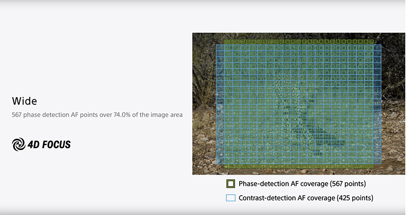 對焦速度方面官方沒有特別強調有顯著提升,不過 567 點的相位對焦點算是十分亮眼(高於 A7RM3 但低於 A9 的 693 點),不過記者會上特別強調 26MP 的 APS-C 裁切下可以達到上下超過 100% 的涵蓋範圍(但左右有留空)的用意,其實小編到現在還在咀嚼當中