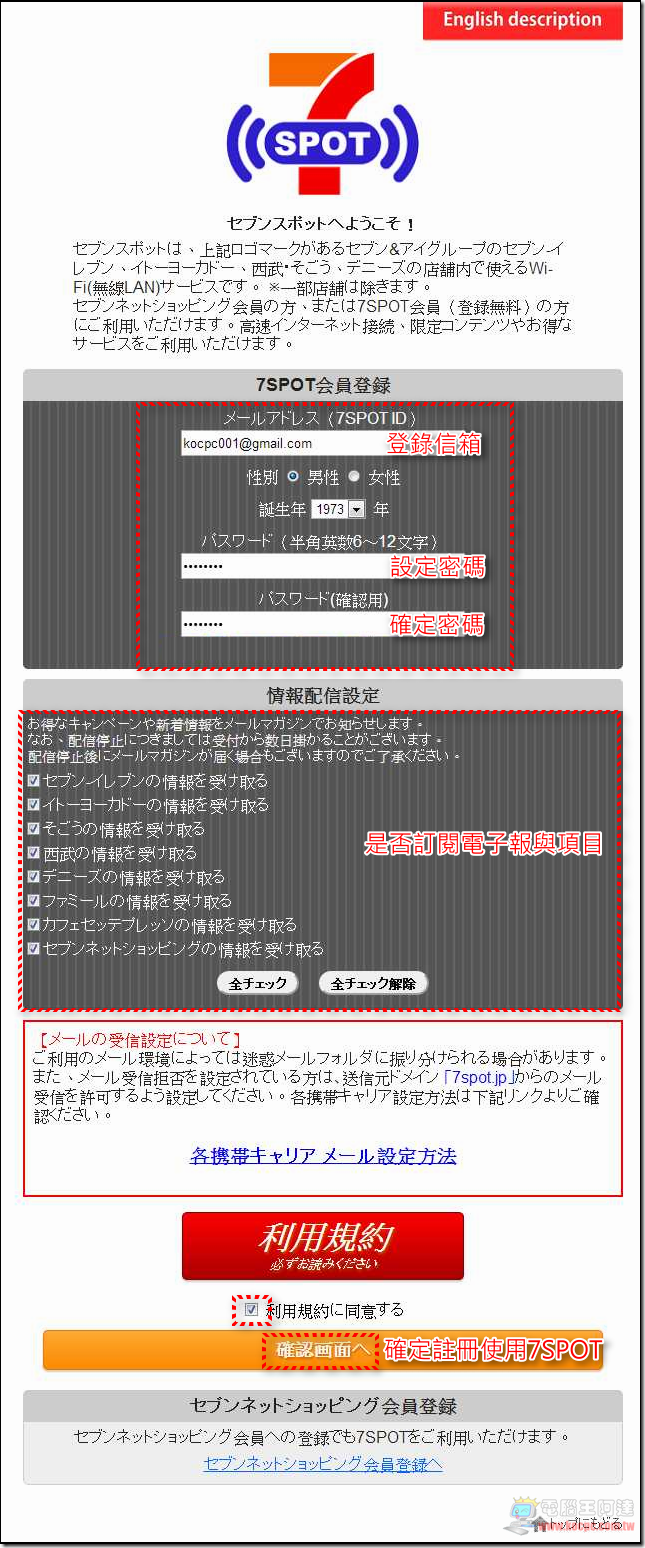 接著輸入您要登入7SPOT的電子信箱、性別、出生年與密碼後往下滑動畫面勾選「同意利用規約」—>執行「確認畫面」: