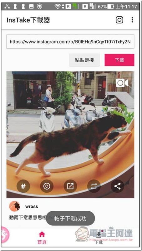 回到 InsTake 下載器後,它就會自動辨識你剪貼簿的連結,並進行下載,完全不需要操作任何功能。下載完成後下方也會跳出帖子下載成功的訊息: