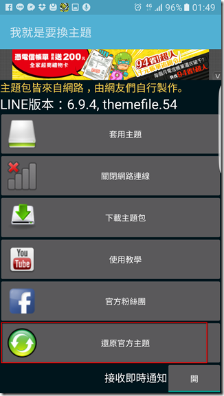 之前如果想改回最早版本的兔兔主題只要執行「還原官方主題」,之後再跳回LINE,您就會發現兔兔主題可以重新下載了,只要重新套用即可: