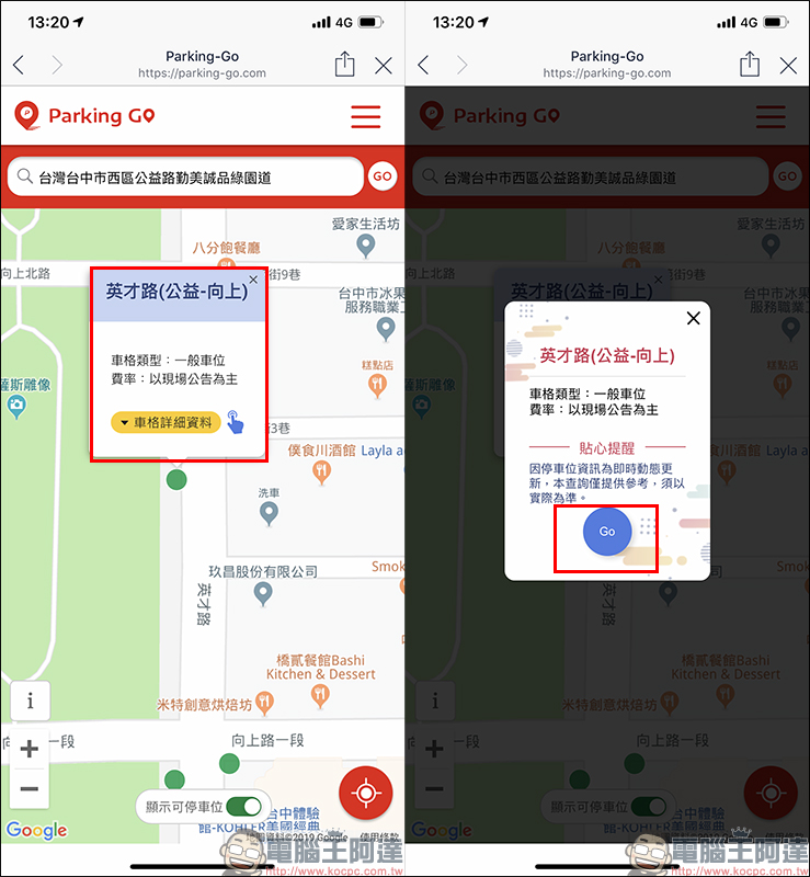 選擇任一空位後,畫面會放大顯示該地點的停車格類型,不過目前多數停車費率並無法從行動裝置上直接查詢。當確定要前往該停車格,只要點擊「車格詳細資料」後並按下「Go」按鈕,便能開啟 Google Maps 的導航功能: