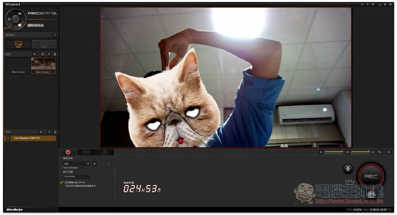 新增的 CAM 313 攝影機畫面可以自由在場景內進行拖曳、放大、與縮小,通常大部分主播的習慣都是把自己的畫面放在實況上傳畫面的右下角,也不用調得太大,主要是讓別人看清楚你的表情和肢體動作為佳。你也可自由新增圖片、短片等素材用於關台之前的謝幕之類的,用心把控好每個場景的材料,把這個畫面當成你的個人電視台畫面來安排。以上我們大概已經把「擷取與串流」的所有大項目都先帶各位看過了,接下來讓我們看看設定的部分: