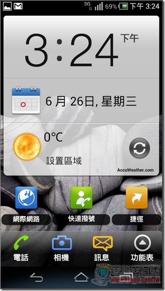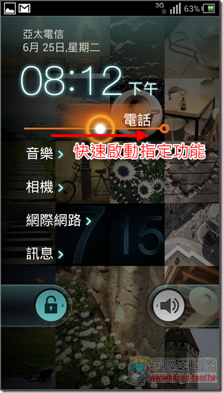 解鎖畫面陳列了「電話」、「音樂」、「相機」、「網際網路」與「訊息」的快速解鎖啟動功能(可自行修改選項):