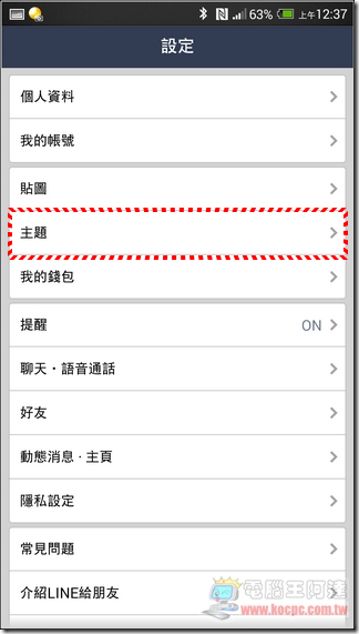 繼續執行LINE—>選擇「其他」—>「設定」—>「主題」—>「主題一覽」—>套用「兔兔」主題: