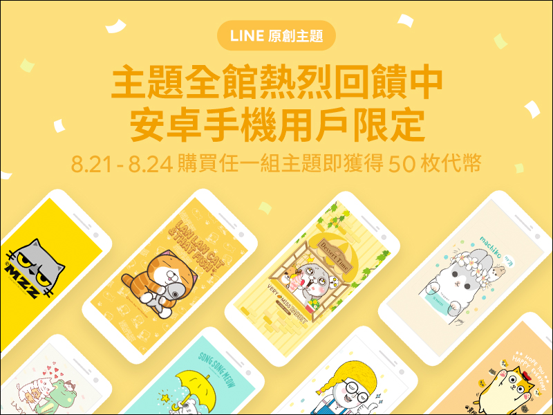 為了歡慶「主題」加入全新主頁介面,即日起至 8 月 24 日凡是購買任一組 LINE 官方或原創主題,即可獲得 50 枚代幣: