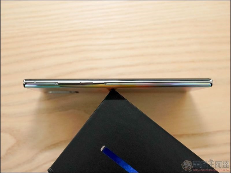 機身背面特寫,這次 Note10+ 共有星環白, 星環藍, 星環銀, 星環黑等四種配色,都相當的好看,而阿達手上的是星環藍,鏡面反射相當好看(還可以拿來當化妝鏡XDD),而且正反兩面都使用了康寧 Gorilla 6 大金剛玻璃,更加抗摔堅固(但建議還是裝著保護殼吧,硬著陸大都很慘):
