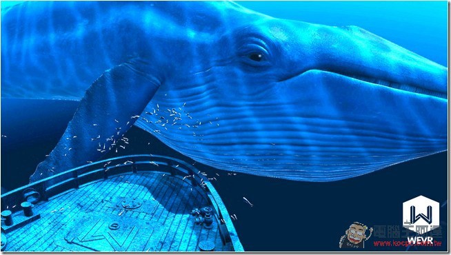 小編曾為了想要看清楚海底的內容,往前走一小步看,但是因為觸控到空間邊緣而啟動了警告線,視線的周圍漂浮著小小的氣泡,也有不少小魚在四周嬉戲。正當小編拿著控制器在跟小魚遊戲時,突然跑出一頭超大的鯨魚出現在小編的眼前,這頭鯨魚之大,讓小編看的是目瞪口呆,牠還特地游到小編的面前,碩大的眼睛盯的小編看,讓小編整個發毛,甚至還開口問工作人員說「我能拿控制器砍他嗎?」最後牠似乎看膩了小編,就這樣自顧自的遊走,看著牠悠哉的漫漫遊走,也讓小編喘了一口氣。