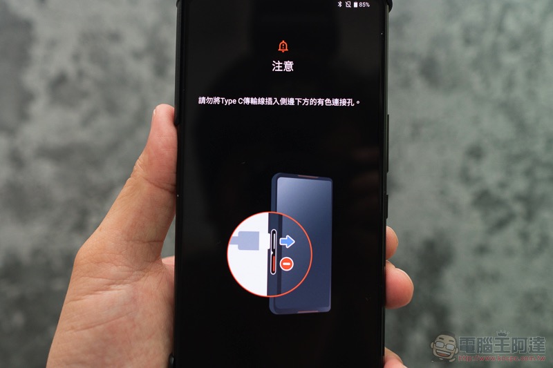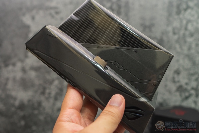 玩 ROG Phone II 配件一定要露出… ROG Logo 的啊(堅定眼神),需注意的是,這個殼由於具備有實體連接的接點,所以拆裝時須先從頂端卸下,再把底部有 USB-C 插頭的部分拔除: