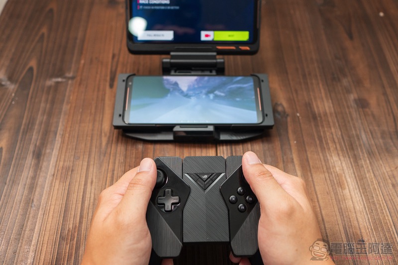 裝的保護殼,甚至是可以 GamePad 套組也都可以上身(就像這樣,真正的 ROG Phone II 指揮艇組合):