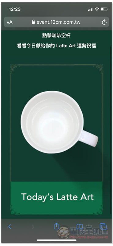 這次抽的方法很簡單,點一下畫面中的空杯即可,它就會自動填滿咖啡,然後告訴你的祝福運勢以及抽中什麼獎項: