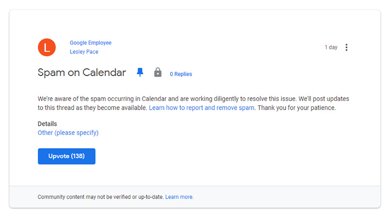 Google 表示使用者也可以主動提報討人厭的垃圾邀請或事件通知,而且建議大家不要去回覆這些邀請,以免導致垃圾行程在你的行事曆上被保留為過期的活動。雖然手動設定有點煩人,但總好過被垃圾掩埋影響工作來得好,相信 Google 應該很快就能解決這個麻煩。