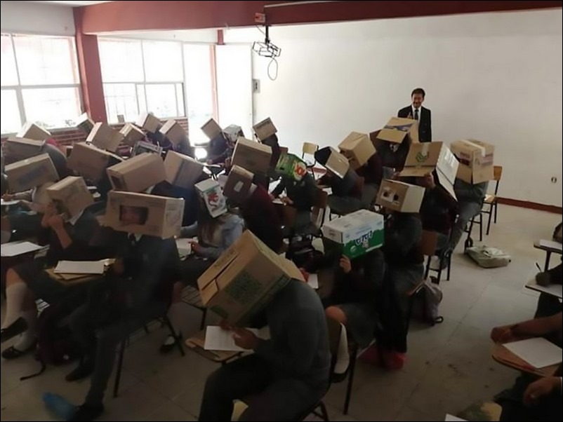 為了考出好成績獲得肯定,有天分的學生會選擇努力應試,刻苦的用功,將知識內化為自己的一部份。但更多沒有這方面天分的學生有時就會選擇作弊,來取得相同的結果,但這樣的過程讓考試的意義蕩然無存,教師往往會透過各種反制手段來防堵學生的作弊。有些時候,為了防止作弊,會需要高科技的幫助,但有時候只需要一點低科技也可以達到相似的效果。例如這位墨西哥的高中老師 Luis Juarez Texis ,他選擇使用紙箱來遮蔽學生的左右視線餘光,讓學生只能專注面對自己的考卷。而這樣做的好處不言而喻,就算學生在考試期間轉動頭部,也能夠在監考時直接看出端倪,進而發現到學生的意圖: