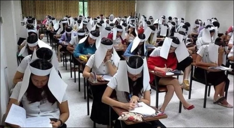 當然,這也不是世界上第一個因為防止學生作弊而引發爭議的事件,比方說,泰國農業大學曾為了防止學生作弊,透過學生的發想而產生了一種防弊頭帶,頭帶的左右邊各自用釘書機釘上白紙來阻擋左右視線。泰國的某個高中也出奇招,請學生坐在地上,將考卷鋪在椅面上寫,並且讓大家都撐起傘來,阻擋左右視線以進行考試。中國的安徽省某高中也有類似的點子,將報紙挖洞讓學生戴在頭上,將前後左右的視線全部遮住,只能看到考卷的程度。比利時的托馬斯莫爾大學學院甚至啟用無人機,在教室內盤旋防止學生作弊: