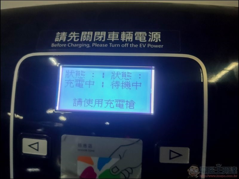 雖然說充電不收錢,但是要使用前還是要先找張悠遊卡或具備悠遊卡功能的信用卡過卡一下,這樣充電槍才會過電: