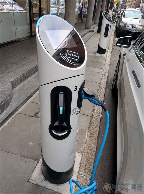 倫敦的充電設備,除了有公版接頭以外,還有一個接頭可讓車主安裝自己的充電線(特斯拉就是用自己的充電線),一樣是感應付款: