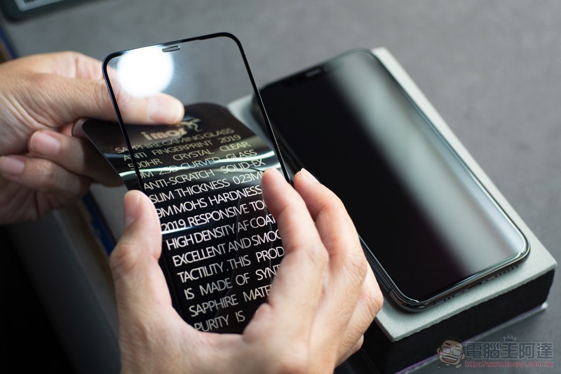 為了要讓大家更了解不同玻璃保護貼的差異,膜斯密碼團隊也很大方地直接讓我們體驗一下三款玻璃保護貼之間的差異,首先是最高階的 imos 藍寶石 點膠滿版玻璃: