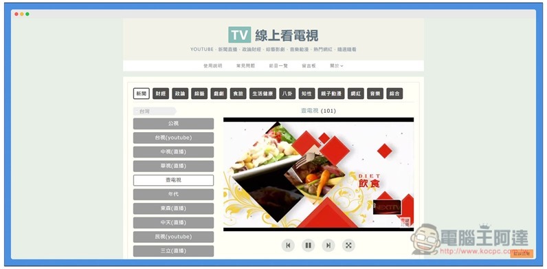 先前我們曾介紹過一款手機版免費且完全合法的 MixerBoxTV App,當時就有很多網友問說,有沒有電腦版的?這篇要推薦的 線上看電視 就是,提供上百台頻道,從新聞直播 、政論財經、綜藝影劇、音樂動漫、熱門網紅、親子類型、甚至韓劇都有,而且所有來源都 100% 合法,皆自於官方的 YouTube 頻道,隨選隨看。基本上有了這網站,就不再需要第四台了。
