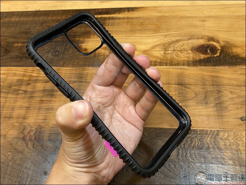保護殼背蓋採用晶透的加硬處理硬殼背蓋,能提供防刮和持久的保護力。此外,針對手機落摔時容易接觸到地面的機身四角,也在內部採用氣墊設計能有效提供吸震保護力: