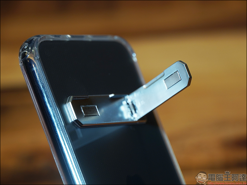 這內建保護殼上的支架選用鋅合金材質,無論是手感、穩定度的平衡都拿捏恰到好處: