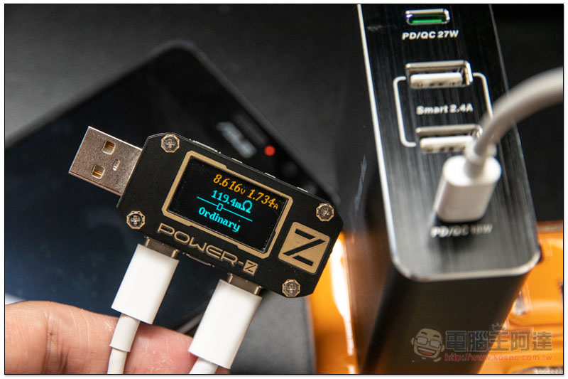 上方的 60W 雖然沒有說支援 QC3.0/QC4+,但因為瓦數夠大,充電速度也是可以跑到 8.953v/1.694A,不過用這個孔充手機是有點太浪費(笑):