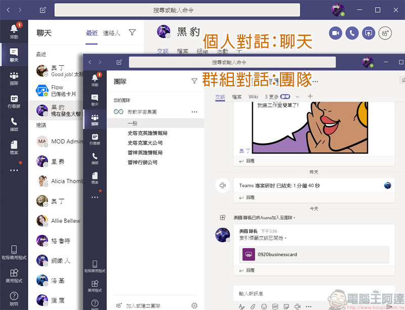 以組織的角度來看,最重視的就是即時資訊流通,雖然坊間已經有許多類似的商用或社交平台能夠做到最基本的對話、通話等,但大多數並沒有完整的商務型整合功能。在 Microsoft Teams 中從文字訊息、視訊對話、安全性乃至於各項細節皆是以企業級別的最高規格所打造,因應商務需求增強像是檔案、對話分類、行事曆等功能,並且可整合其它應用來串接使用,讓它變得更強大、更符合組織需要,是一款非常適用於工作群體的平台。