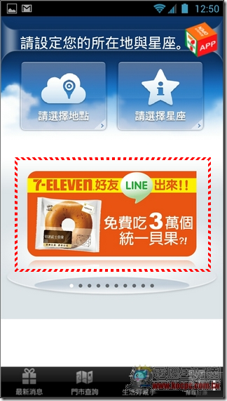 進入後就有活動訊息,由於還沒開始,裡面先有詳細的活動訊息,簡單說就是今天早上11點30分起到 8/2 止連續三天,只要由 7-11 App進入「7-ELEVEN好友LINE出來 免費吃3萬個統一貝果」活動,回答問題並用LINE分享給好友就會獲得一組兌換序號,之後就可以到7-11 ibon列印兌換券換貝果,每日限量一萬個,三天共三萬個貝果可以兌換: