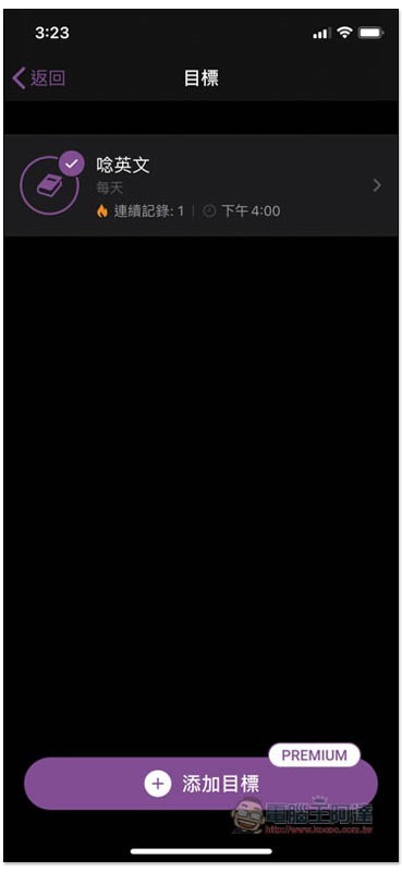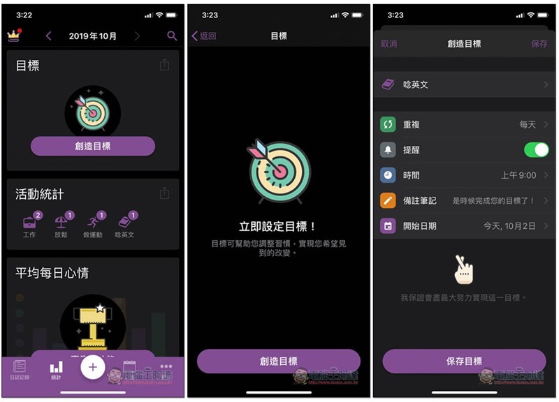 除了日記外,它還提供一個我覺得很不錯的「目標」功能,從活動中選擇要創造的目標,像我建立唸英文的目標: