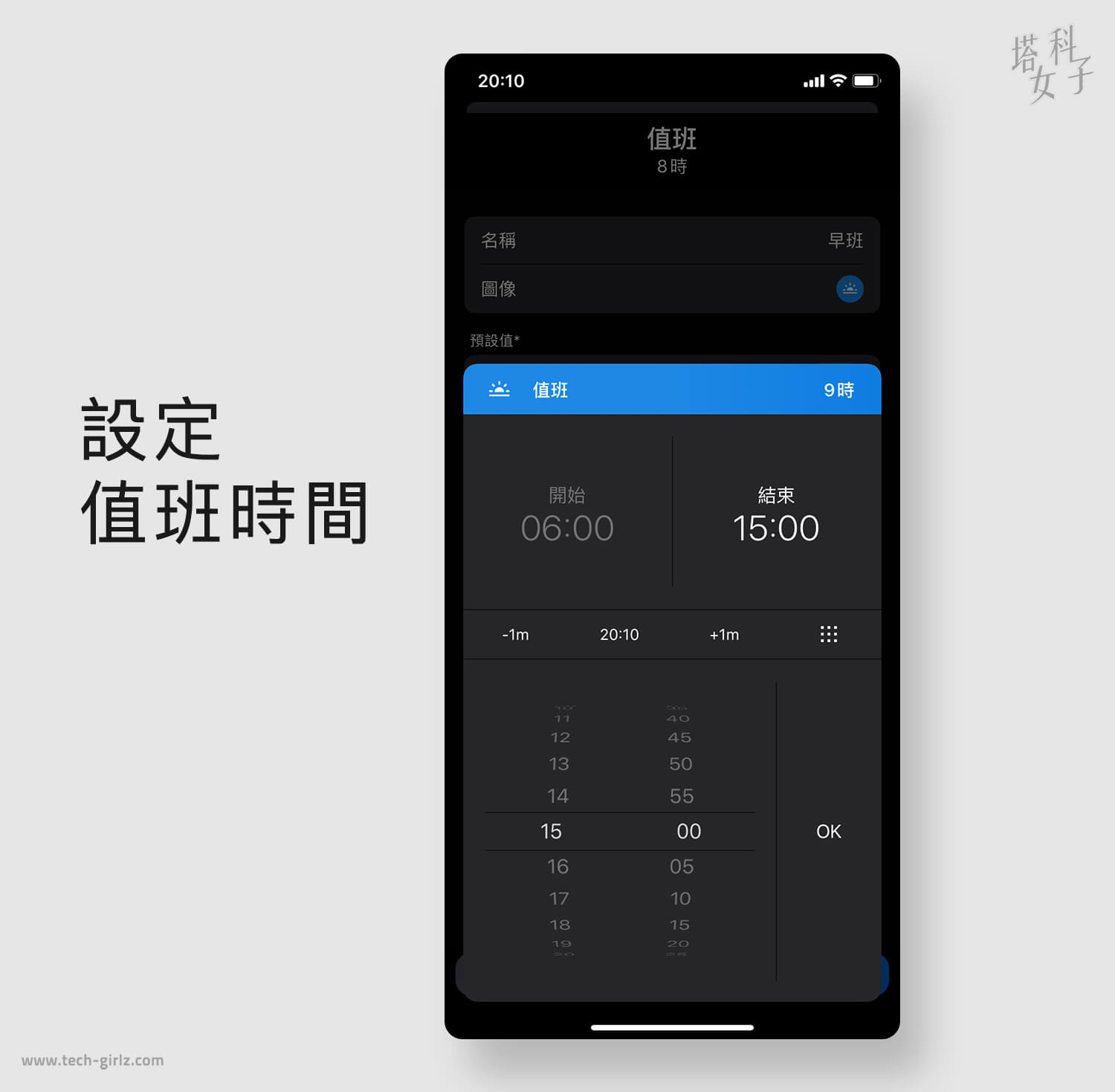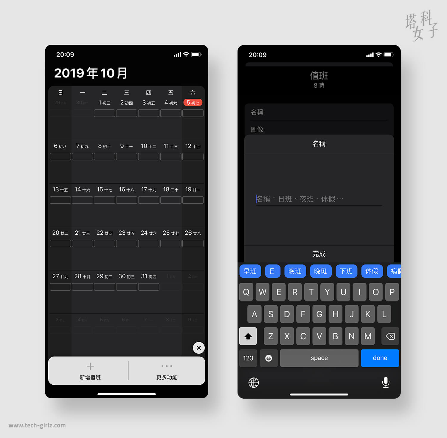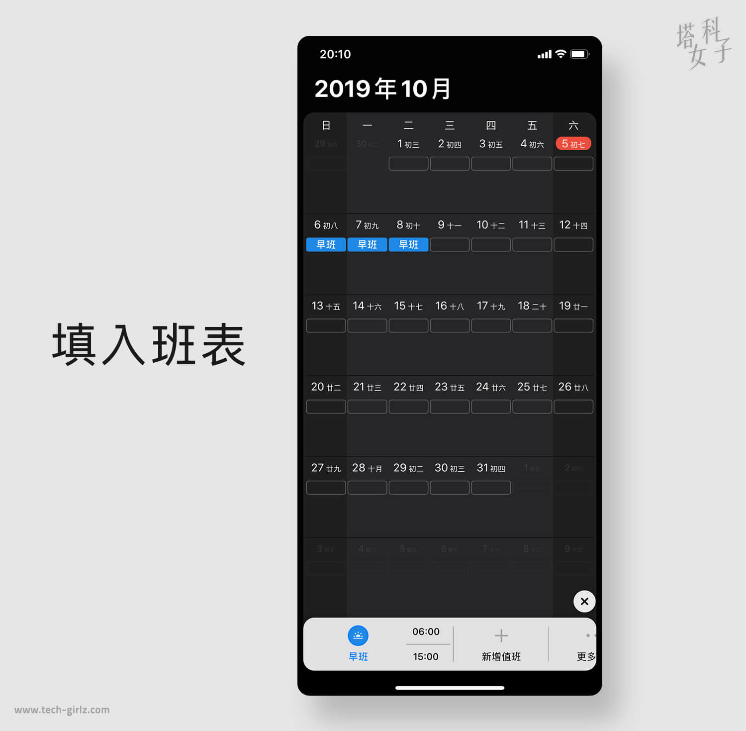 設定好後,在下方的功能列出現了「早班」這個選項,此時你只需要簡單地點選早班的日期,它會自動填入。依據這個方式設定你其他時段的班別。